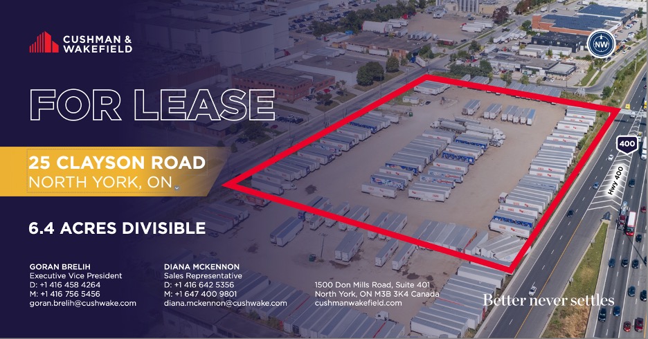 25 Clayson Road offers 6.4 acres of industrial land for lease in North York, City of Toronto, with rare outside storage zoning and immediate access to Highway 400 and Highway 401. This fully secured site is ideal for users seeking industrial yard space, transportation and logistics operations, construction yards, or warehouse support lands in a high-exposure Toronto location.
