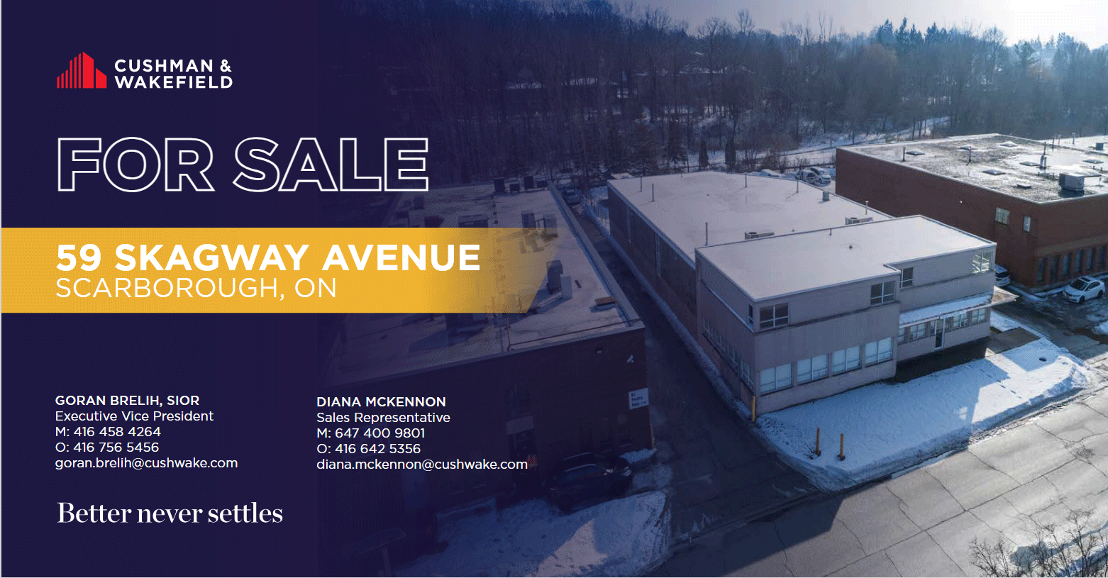 59 Skagway Avenue is an industrial building of approximately 9,355 square feet plus a 1,945 square foot mezzanine on a 0.53‑acre lot in Toronto, Ontario. The property is located in Scarborough, in an established employment node near Brimley Road and St. Clair Avenue East, providing a strong labour pool and urban amenities.