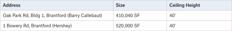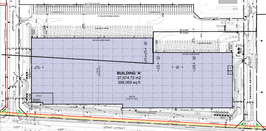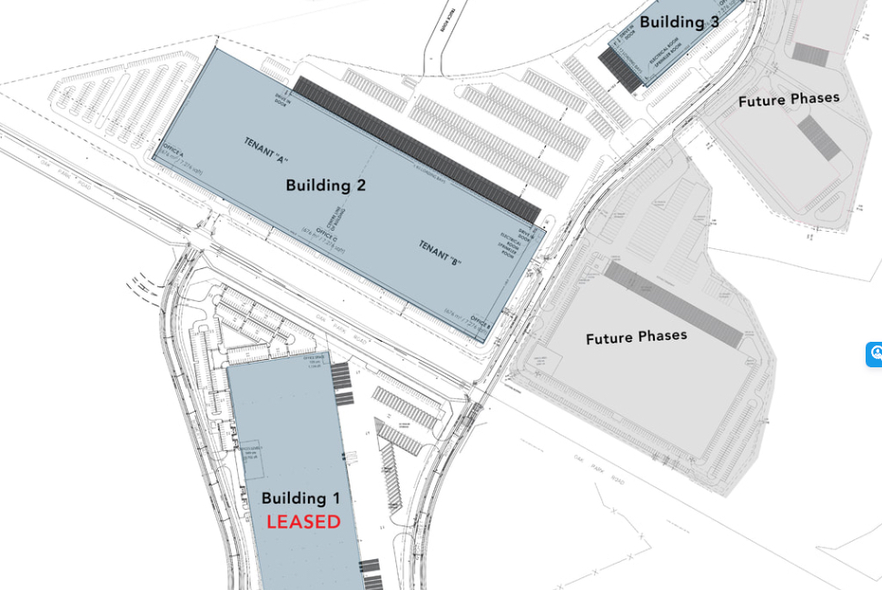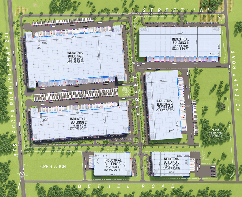 The project will initially see approximately 1.25 million square feet over three buildings delivered in Q4 of 2023, of which, Building 1 (totalling 410,040 SF) has been pre-leased to Swiss-based chocolatier Barry Callebaut. Buildings 2 and 3 will be 727,307 SF and 113, 635 SF in size, with 65 truck-level and 2 drive-in doors, and 12 truck-level and 1 drive in doors, respectively, along with 40 foot clear heights.