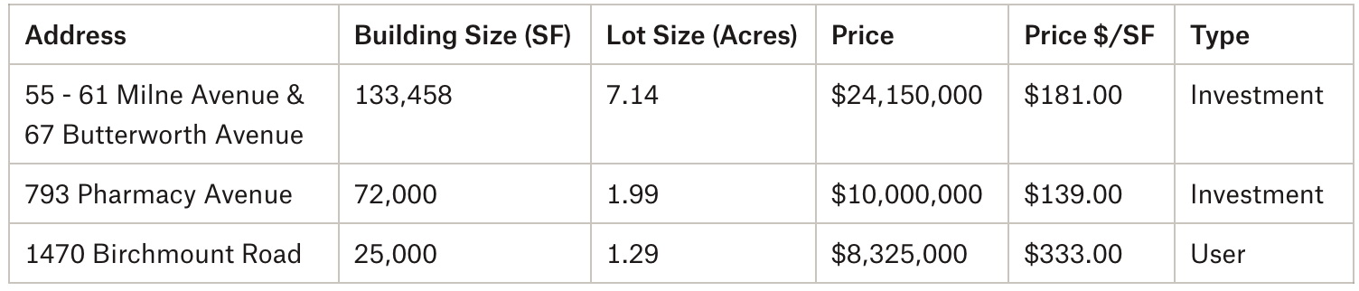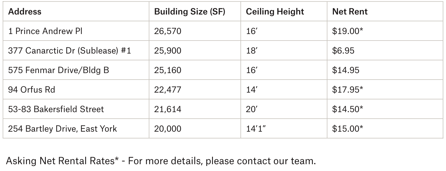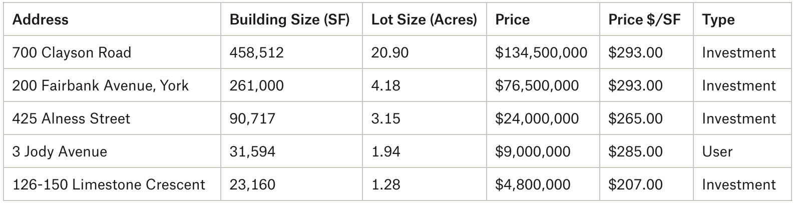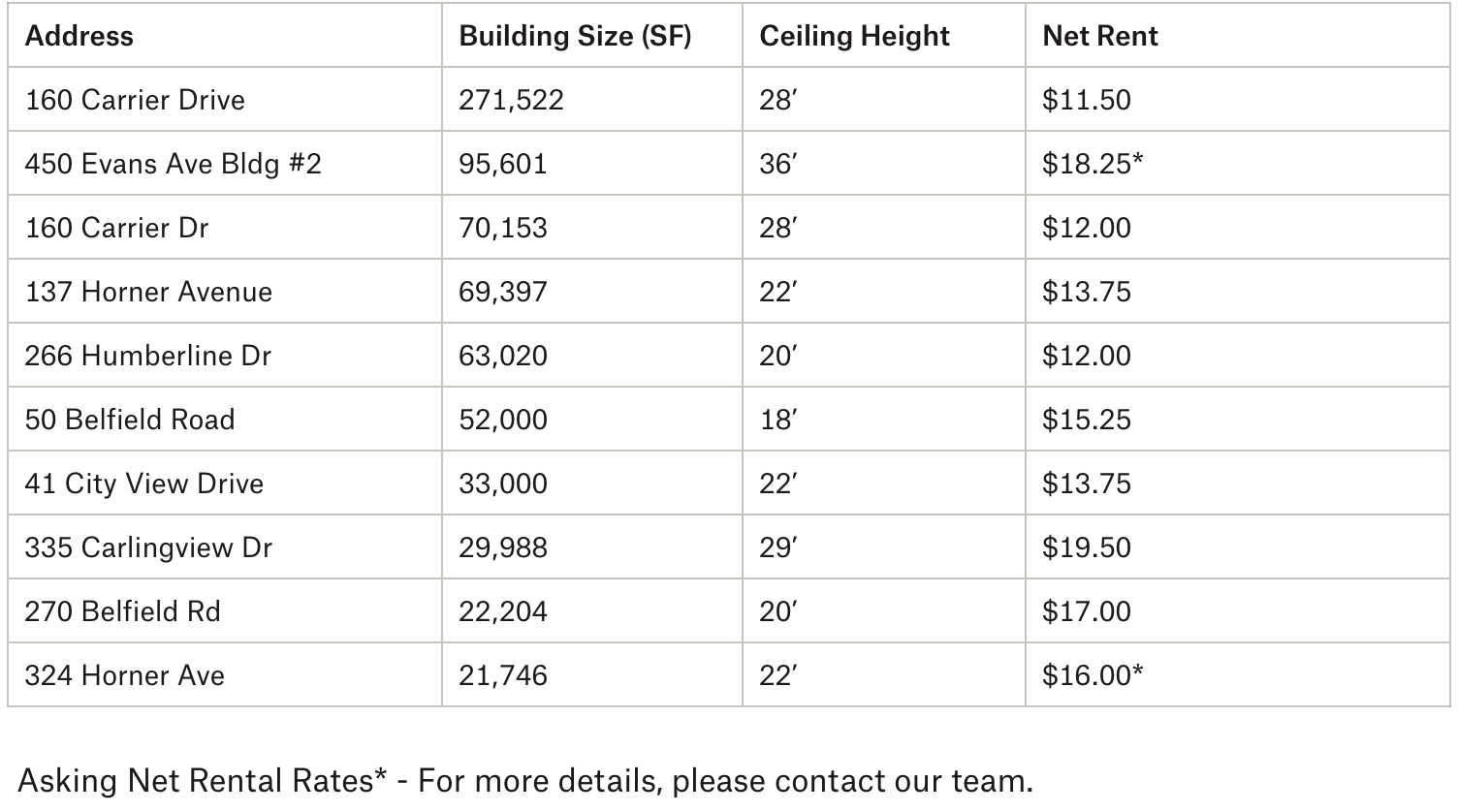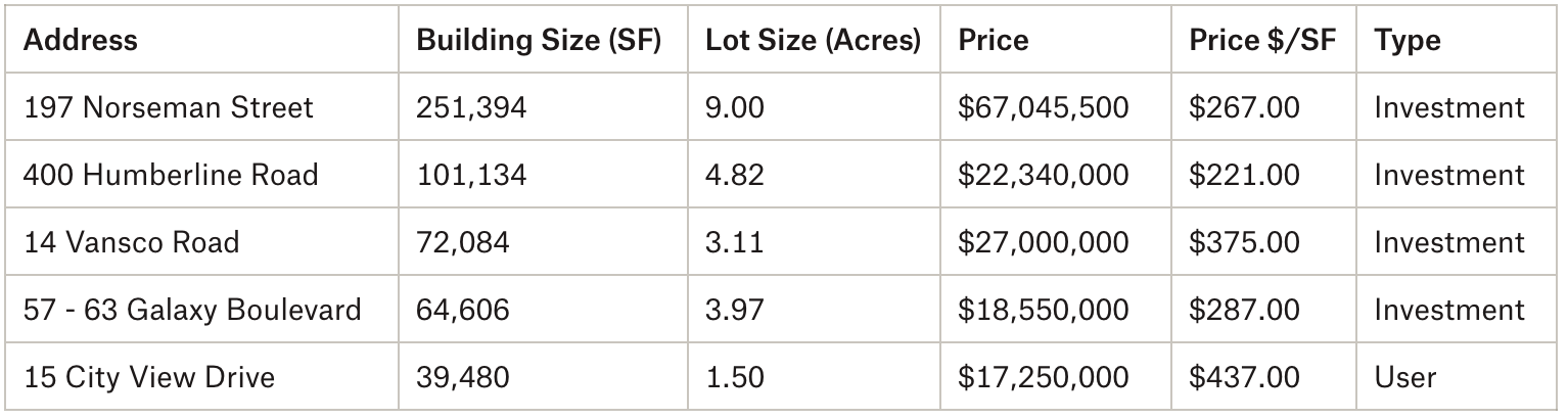 In Scarborough, 12 properties were leased (650,263 SF) at net rents of $10.00–$19.95 PSF, and three properties sold at $139–$333 PSF. North York saw six leases (141,721 SF) at $6.95–$19.00 PSF and five sales at $207–$293 PSF. Etobicoke recorded 10 leases (728,361 SF) at $11.50–$19.50 PSF and five sales at $221–$437 PSF.