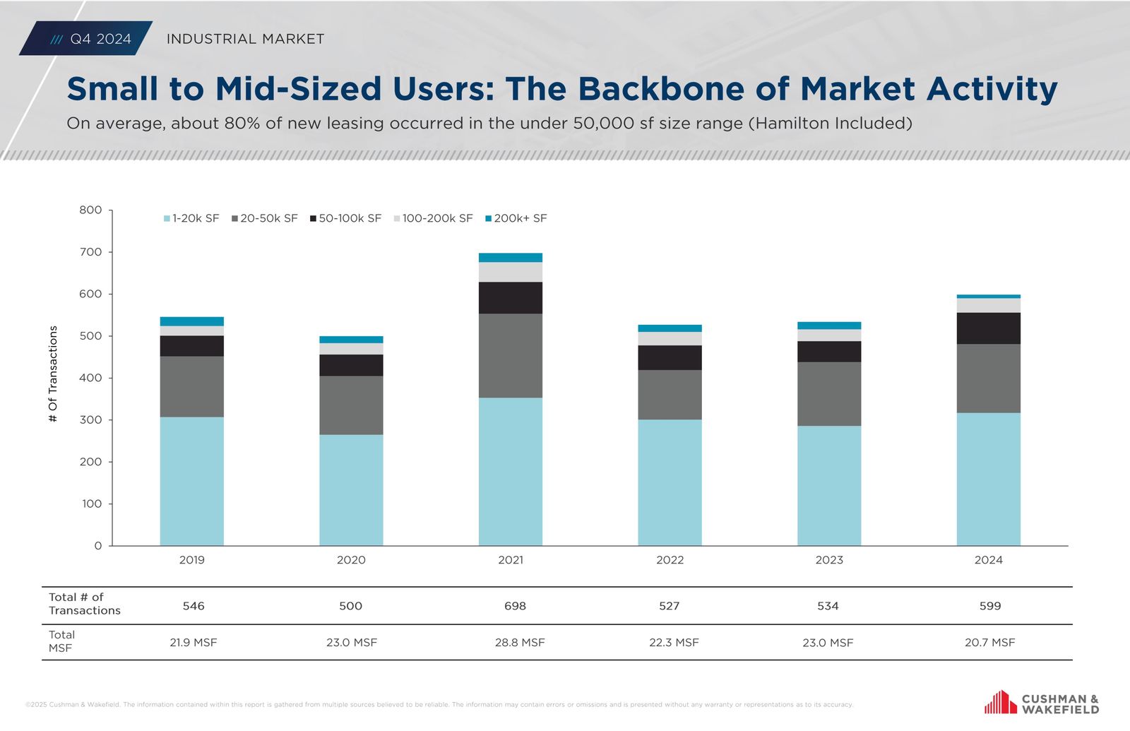 Small and mid-sized users continue to anchor the GTA industrial market, driving roughly 80% of new leases in spaces under 50,000 square feet. From a peak of 698 transactions in 2021 to 599 deals totaling 20.7 million square feet in 2024, this segment’s consistent demand signals stability.