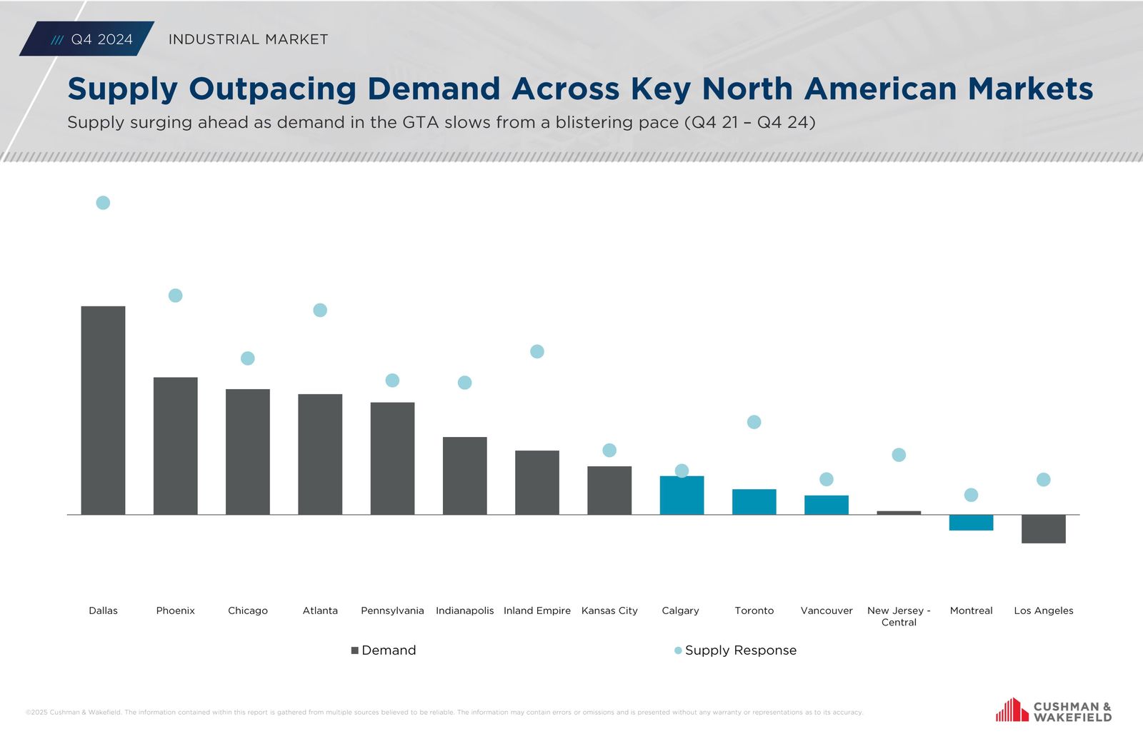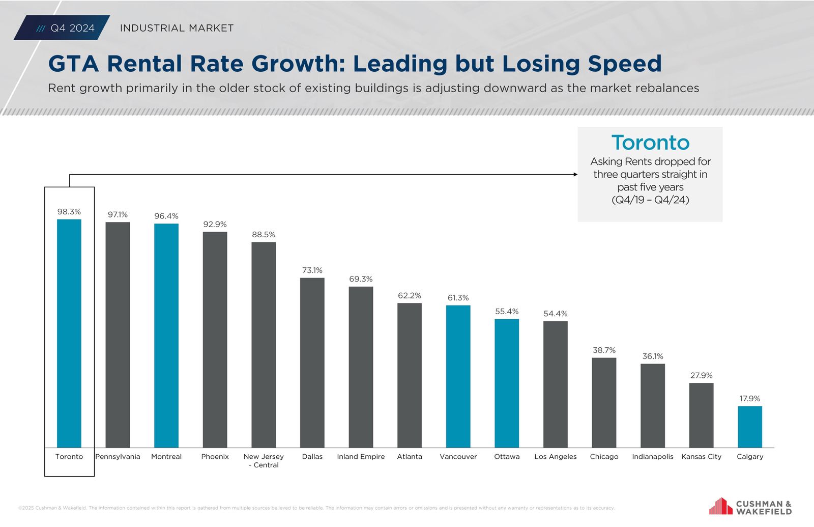 The GTA has long been a frontrunner in industrial rental rate growth, fueled by tight supply and soaring demand in recent years. However, the tide is turning. Cushman & Wakefield’s Q4 2024 report notes that asking rents have dropped for three consecutive quarters—the first such streak in five years (Q4 2019–Q4 2024).