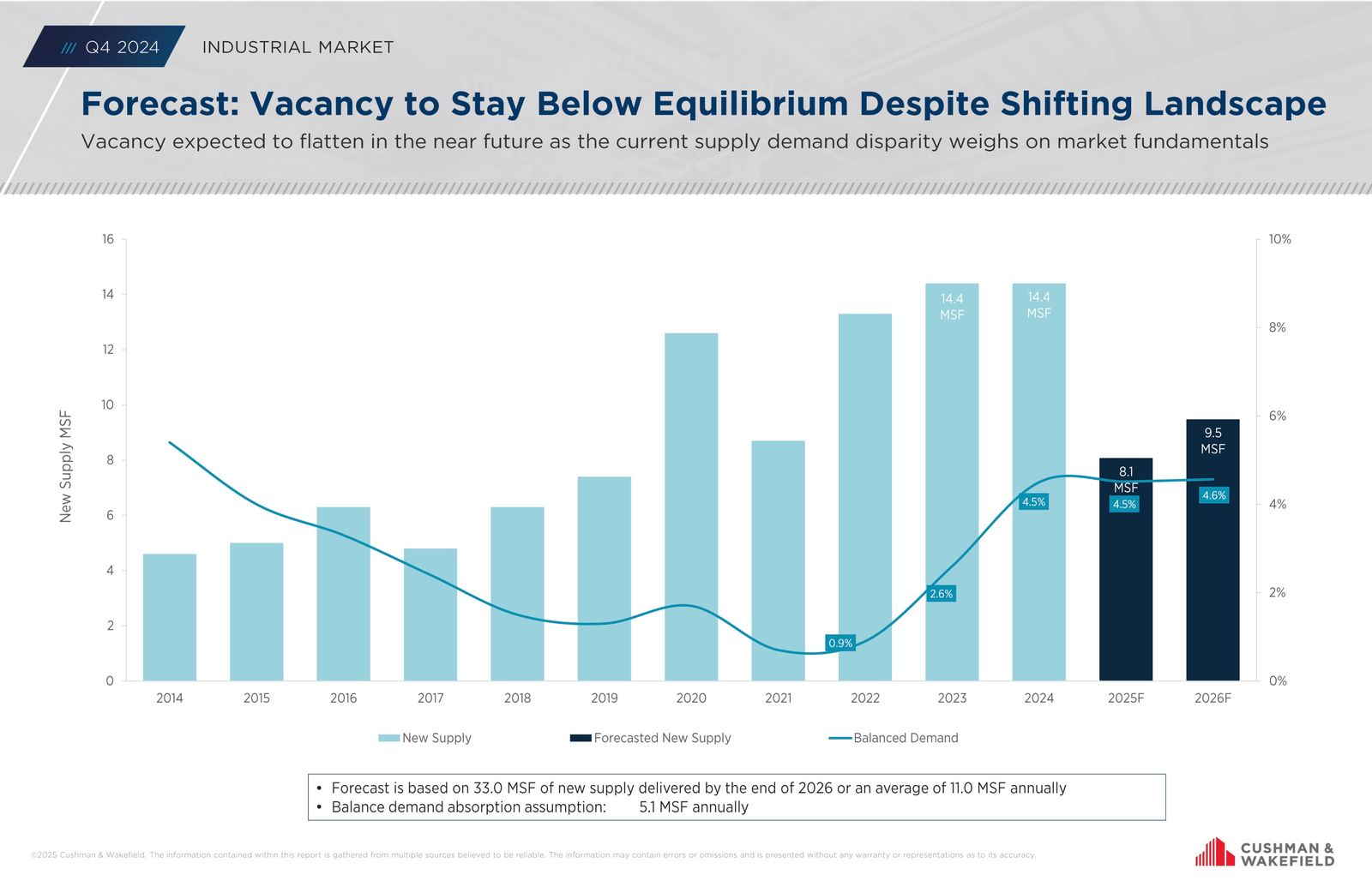 However, stabilization is on the horizon, with vacancy projected to ease below equilibrium by 2026.