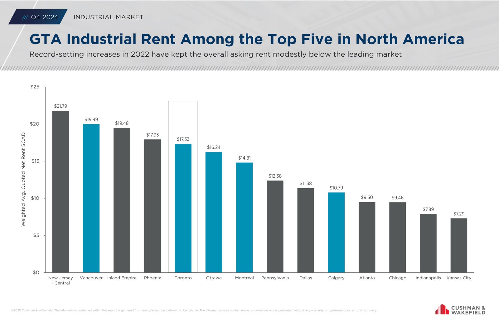 Toronto’s average asking rent stands at $17.33 per square foot, placing it among North America’s top five markets but below leaders like Vancouver ($25) and Inland Empire ($17.93). This softening reflects the market’s rebalancing as vacancy climbs.