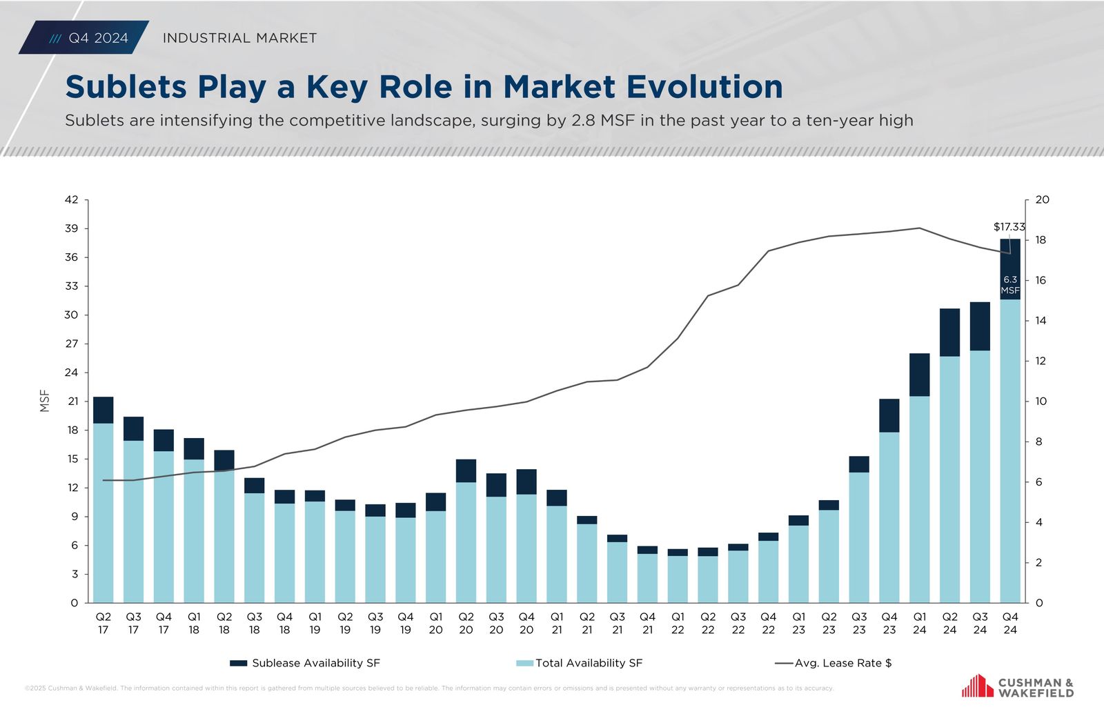 A surge in sublease availability, hitting 6.3 million square feet in Q4 2024, drove total availability to a decade-high 18 million square feet. Despite this, the average lease rate rose to $17.33 per square foot. The growing sublet supply intensifies market competition, offered tenants more options and potentially curbing rental rate increases. This trend reflects evolving tenant needs and suggests a future where rental stability or moderation could dominate as supply continues to expand.