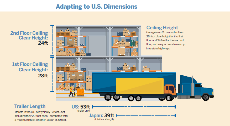 That said, Prologis’ CEO spoke about their Georgetown Crossroads project, saying that it “offers 28-foot clear height for the first floor and 24 feet for the second floor, and easy access to nearby interstate highways. The building’s first floor has loading docks on both sides. The warehouse’s first two floors are able to handle standard, 53-foot-long tractor trailers. Two ramps serve the second floor, with the third level accessible by freight elevators that can hold forklifts. The third floor, with 16-foot heights, is suited for light manufacturing, creative offices, and production.”