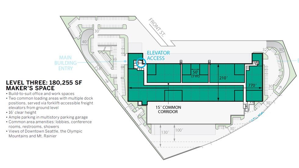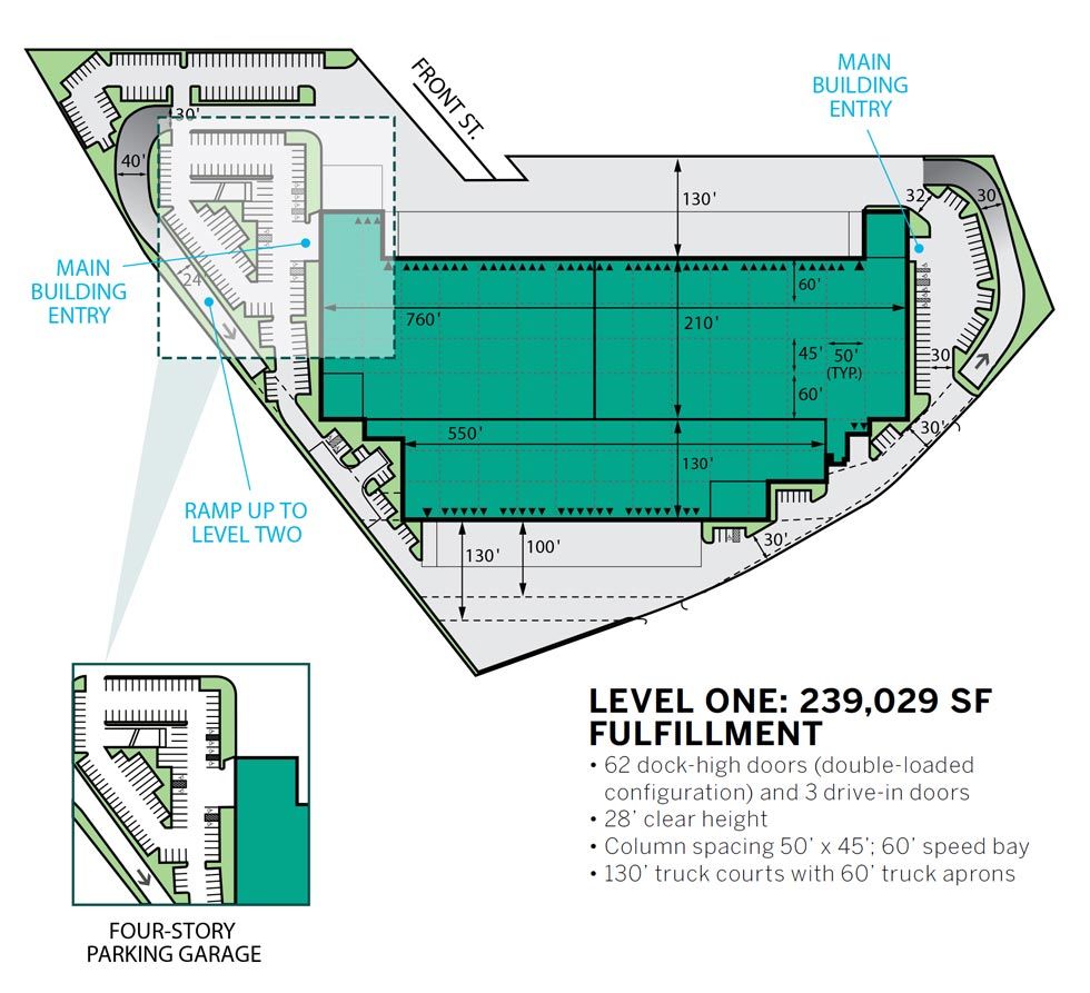 With respect to the top levels, NREI’s feature states that, “the top level is unlikely to be used for goods distribution,[suggesting] that it is suitable as a “makers” space or could accommodate anything from a build-to-suit office to a bakery operation.”