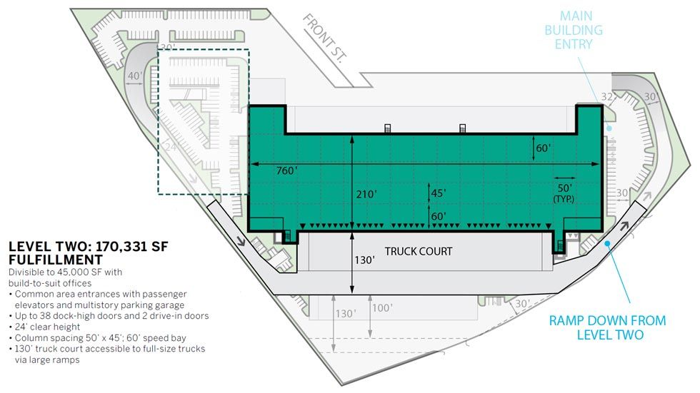 NREI concluded regarding the ramps being limited to the first two levels only, “Prologis has built six- to 12-story industrial buildings in Asia, but the design utilizes spiral ramps that reach all levels. This configuration is only possible because trucks in Asian nations, including Japan, Singapore and China, are only 25’ long, compared to 40’ long in the U.S., noting that U.S. truck length is a function of trucking regulations, which are driven by shipping container size and warehouse height. U.S. multilevel warehouses are designed with ramp access only on the first two levels, so will accommodate different types of users or products on the lower and upper levels. However, with a good enough elevator system, “The sky is the limit.” The third level, with 180,000 sq. ft. of space, is accessible via a freight elevator with two dedicated docks and offers traditional 16’ clear height.”