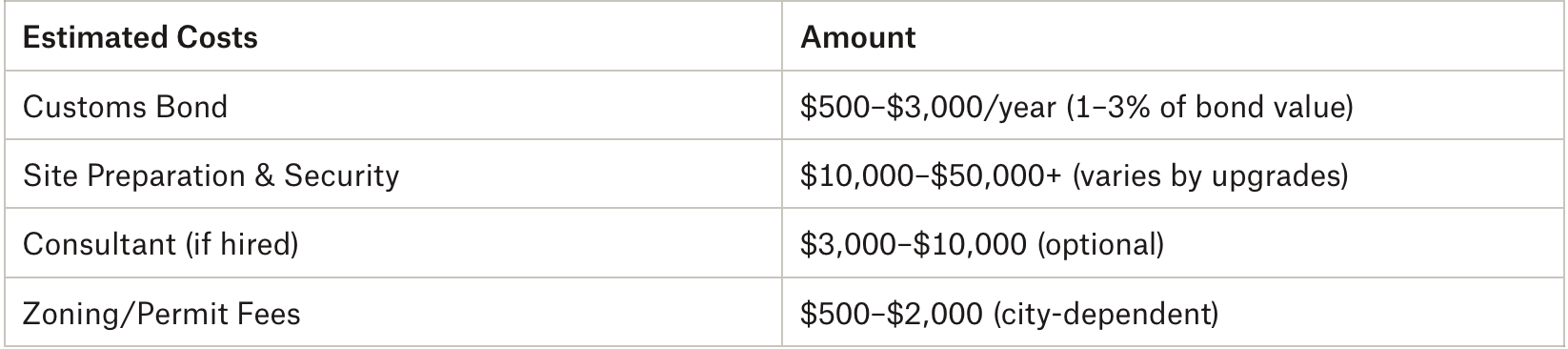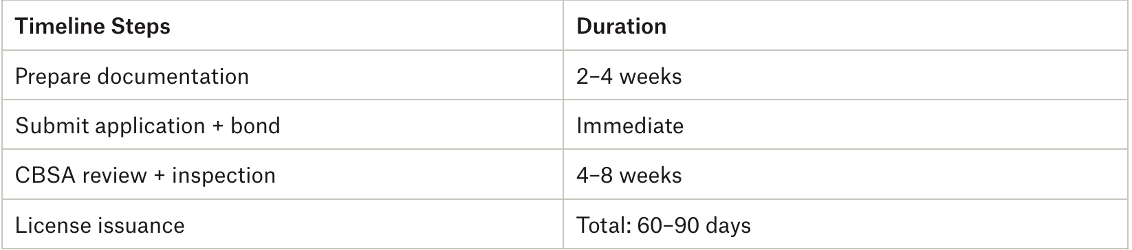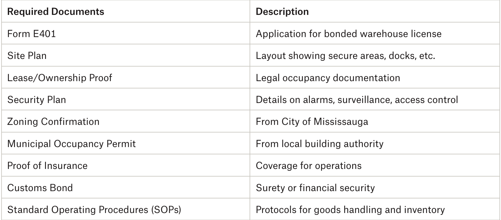 - Submit Form E401 to the Southern Ontario CBSA office, including supporting documents: detailed site plan, lease/ownership proof, security plan, SOPs for inventory, municipal occupancy permit, zoning confirmation, insurance, and a customs bond (typically $25,000–$100,000, costing 1–3% annually via surety companies).