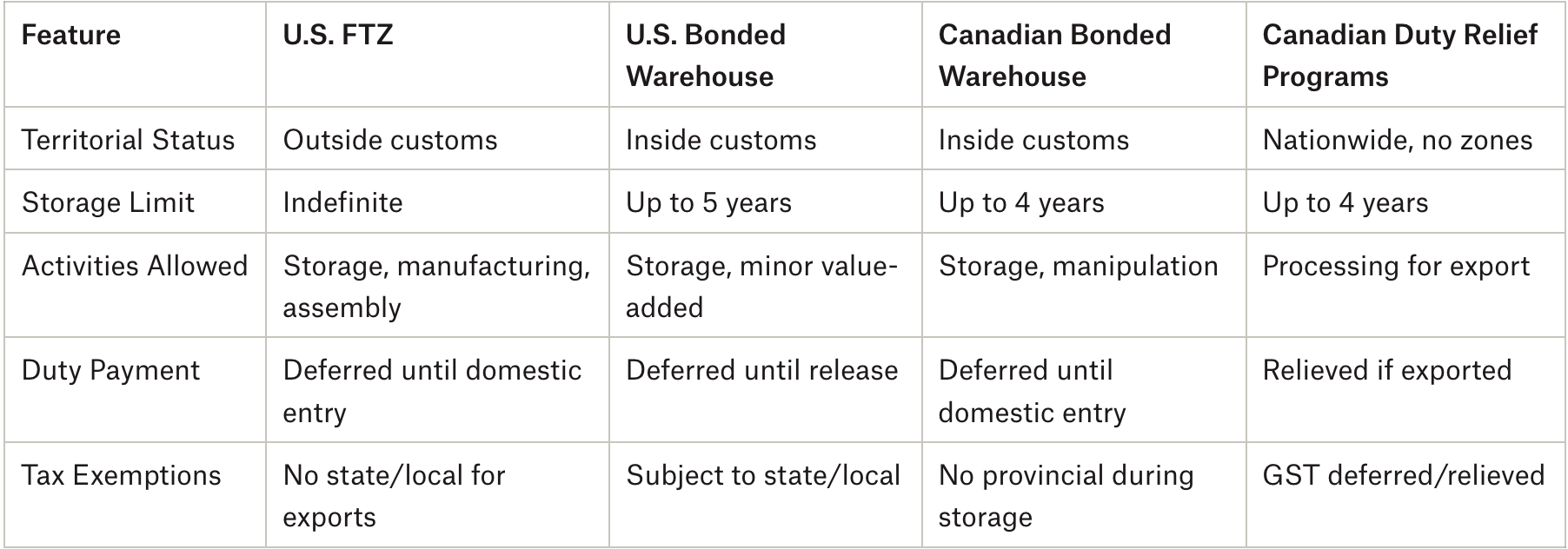 Meanwhile, Canada lacks traditional FTZs but provides equivalent benefits through nationwide programs like bonded warehouses and duty relief, emphasizing flexibility across provinces like Ontario.